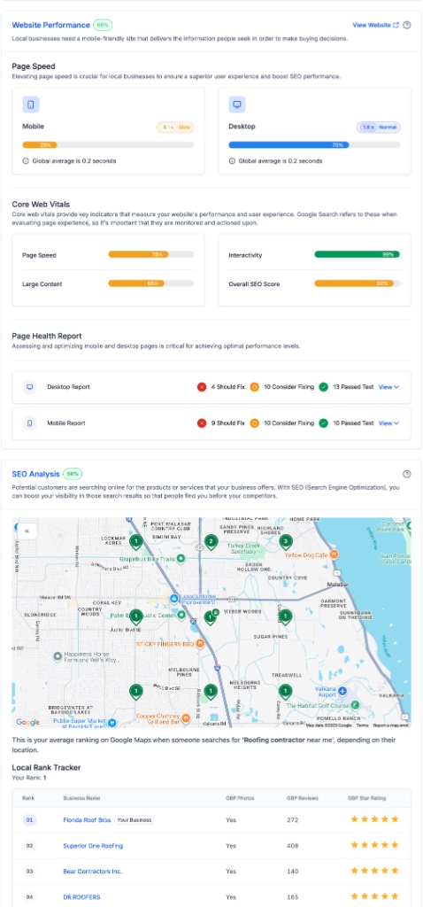 SEO AnalysisVisual heat map showing your local ranking vs. competitors in your neighborhood.
