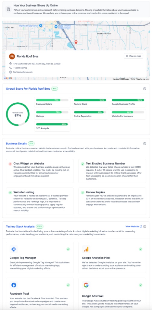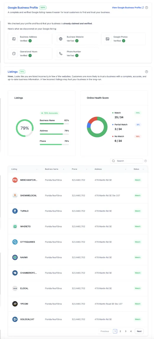 Listings Accuracy Scan 70+ directories (Yelp, Bing, etc.) for missing or incorrect info.