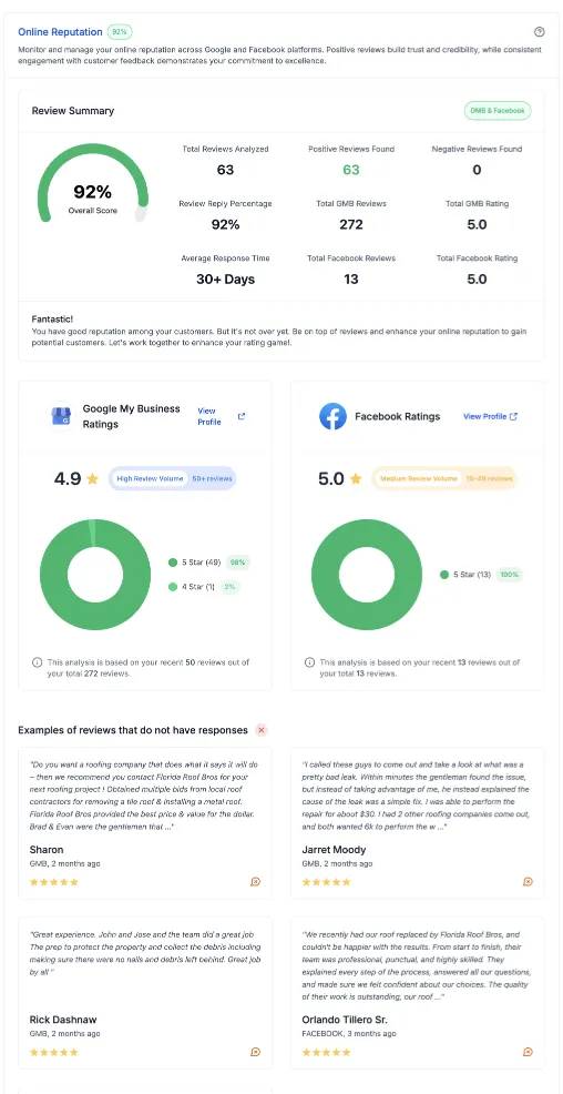Online Reputation Analysis of review volume, star rating, and response rates across Google & Facebook.